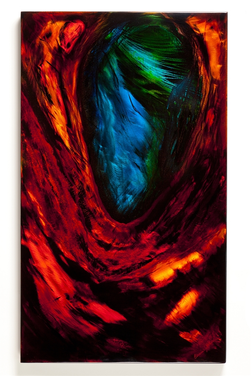Multiple layers of automotive candy paint and polyurethane clear coat bring out dramatic depth within the painting to achieve a three dimensional effect.