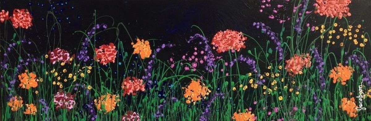 It doesn’t happen every night but on some very special nights, a field of wildflowers can appear almost iridescent. Just as lighting bugs can light up the night, so can the wildflowers. But this magic only comes when there’s a full moon and that’s what Linda has captured in “Secrets of the Night.” Adding to the mystical quality is the panoramic proportions of this canvas since it measures 20 inches tall and an amazing 60 inches long.
