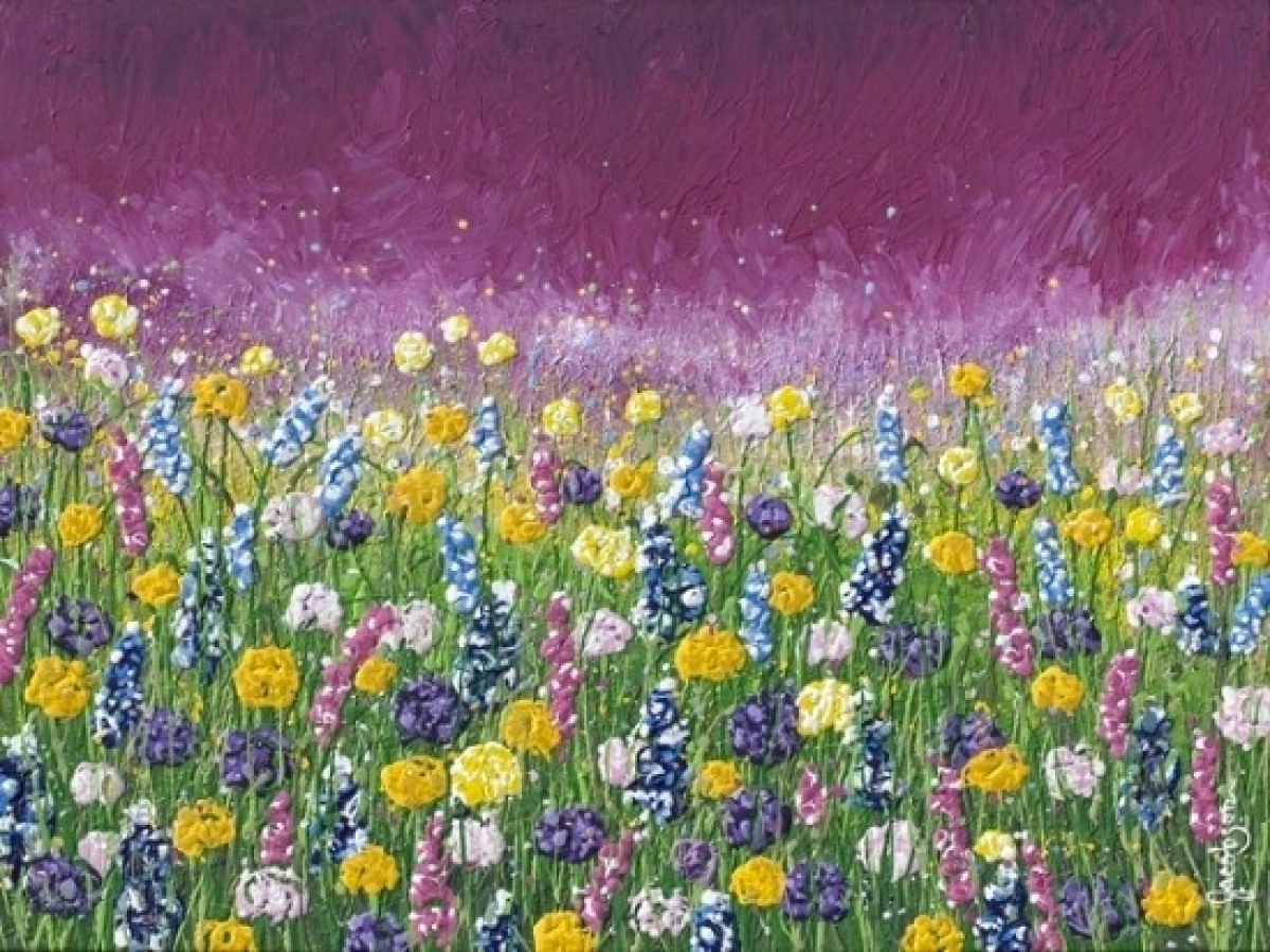 Colorful " Wine Soaked Meadows" clustered with mealy sage, bluebonnets, verbena & lantana blooms.