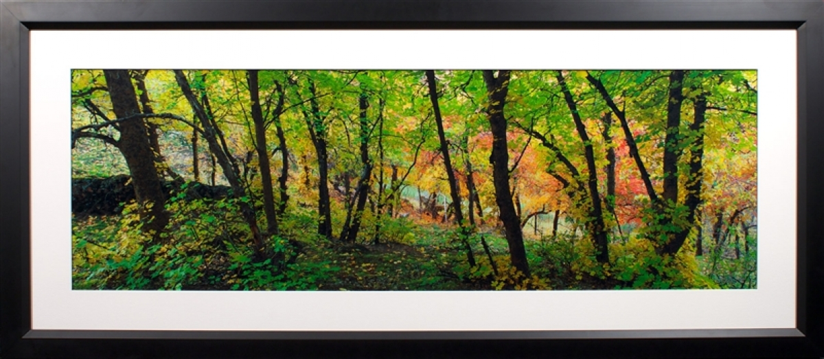 - Chromogenic print with linen-wrapped wood mat behind museum acrylic