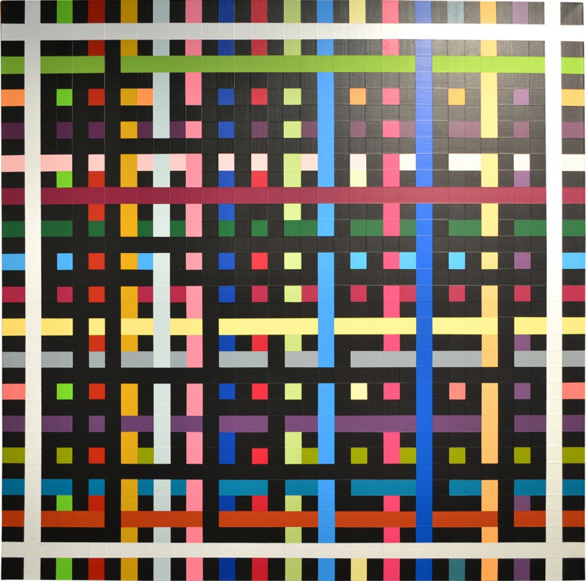 Stitch is comprised of both vertical and horizontal lines. The unique process of line placement and design of these pieces create naturally inherent depth on the canvas. The final result expresses the vision of colors woven across the canvas.