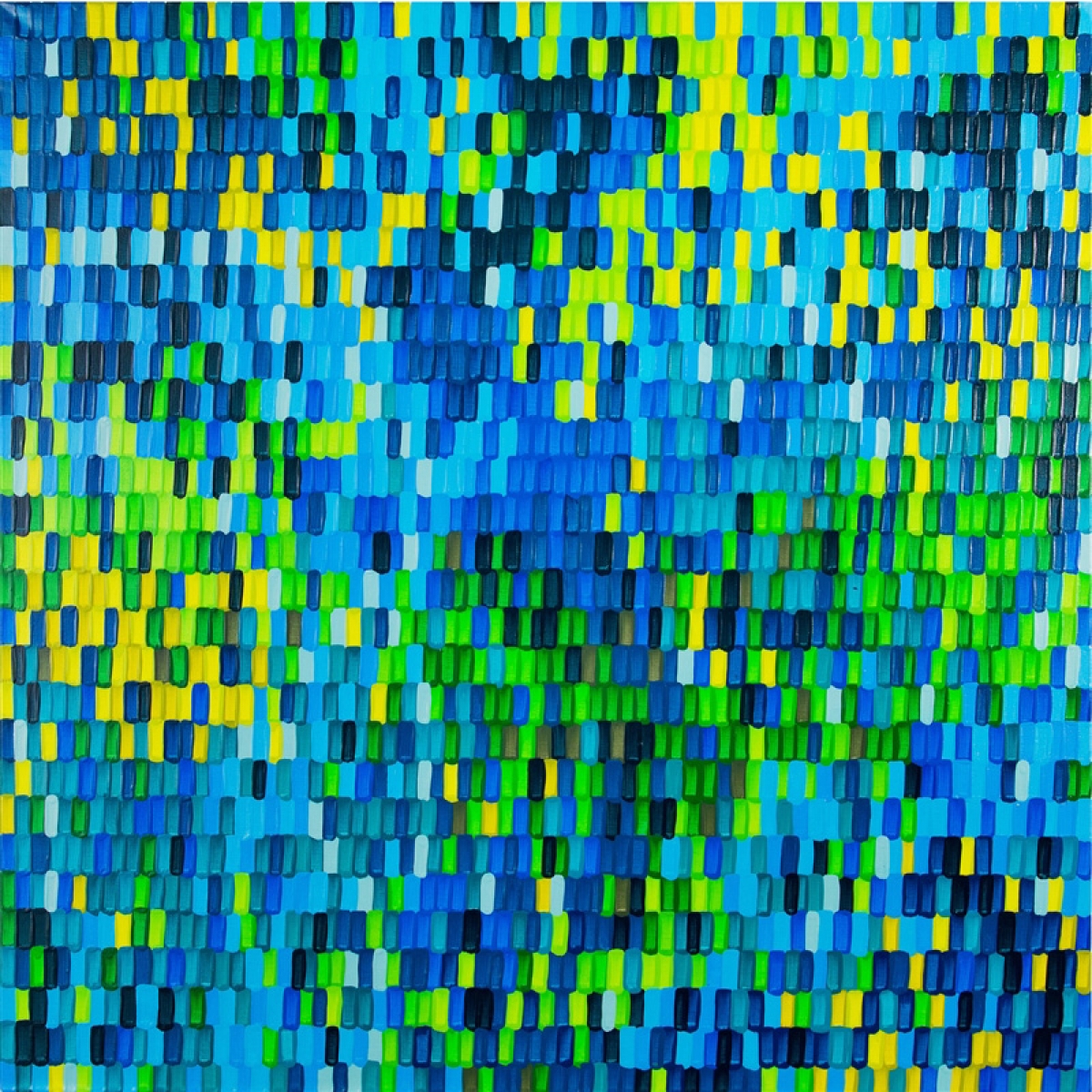 Pixel is created by covering the entire canvas with individual brush strokes or ‘pixels’. Each piece is unique based on the strategic composition of individual strokes. Most pieces use several thousand brush strokes while others use less to complete the vision.