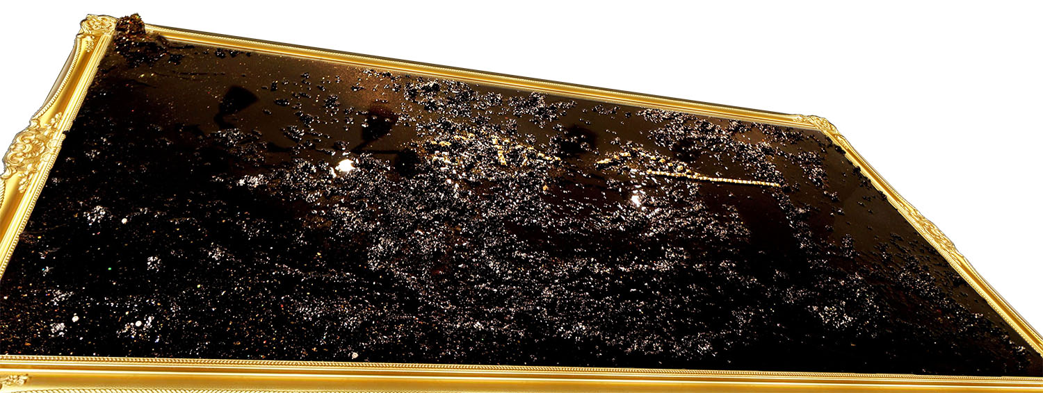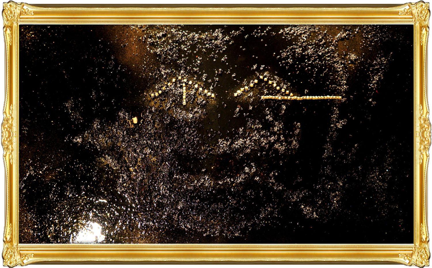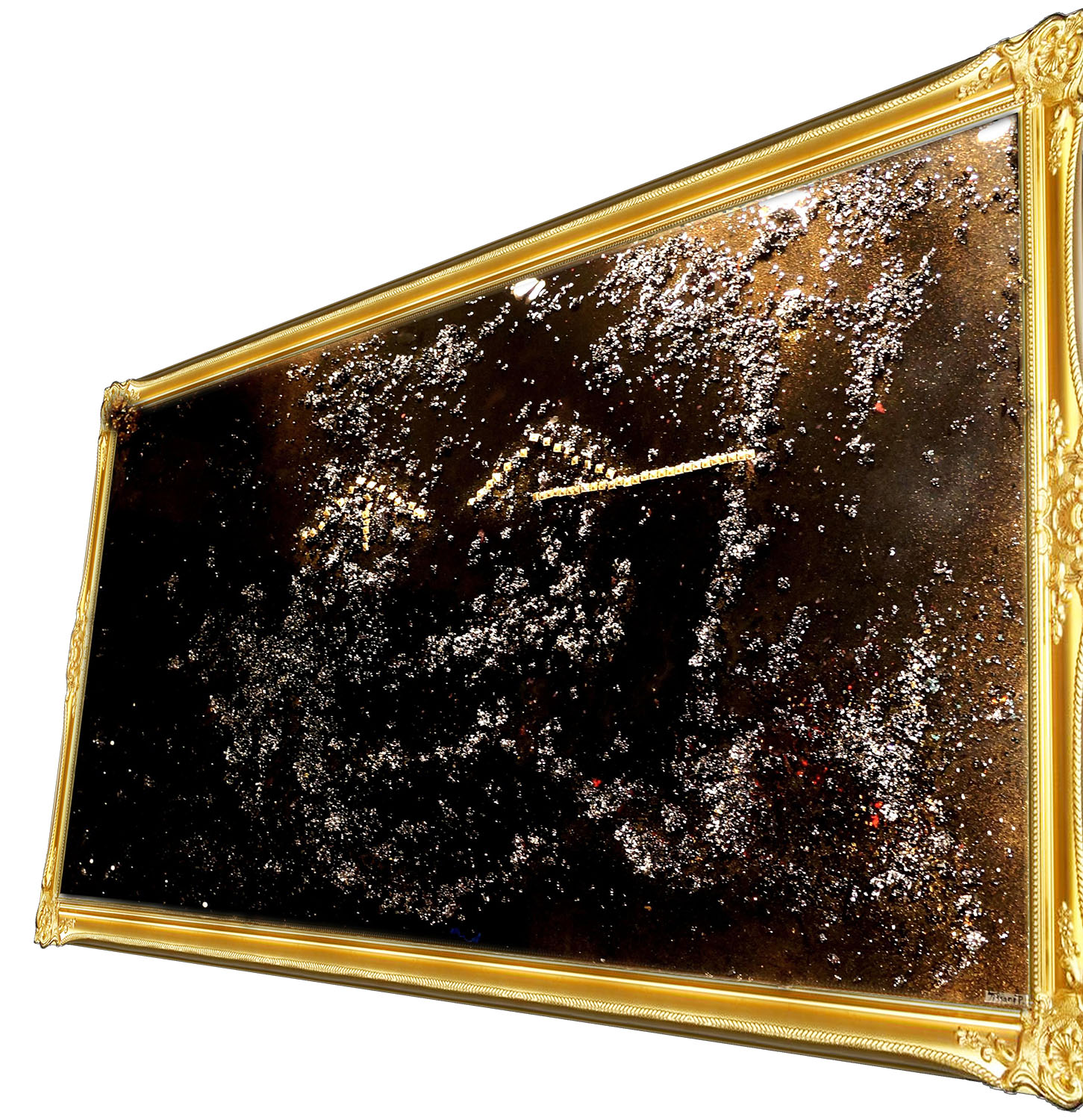 - Mixed media on canvas: acrylic, spray paint, studs, pearls, sparkles, epoxy, celestite crystal