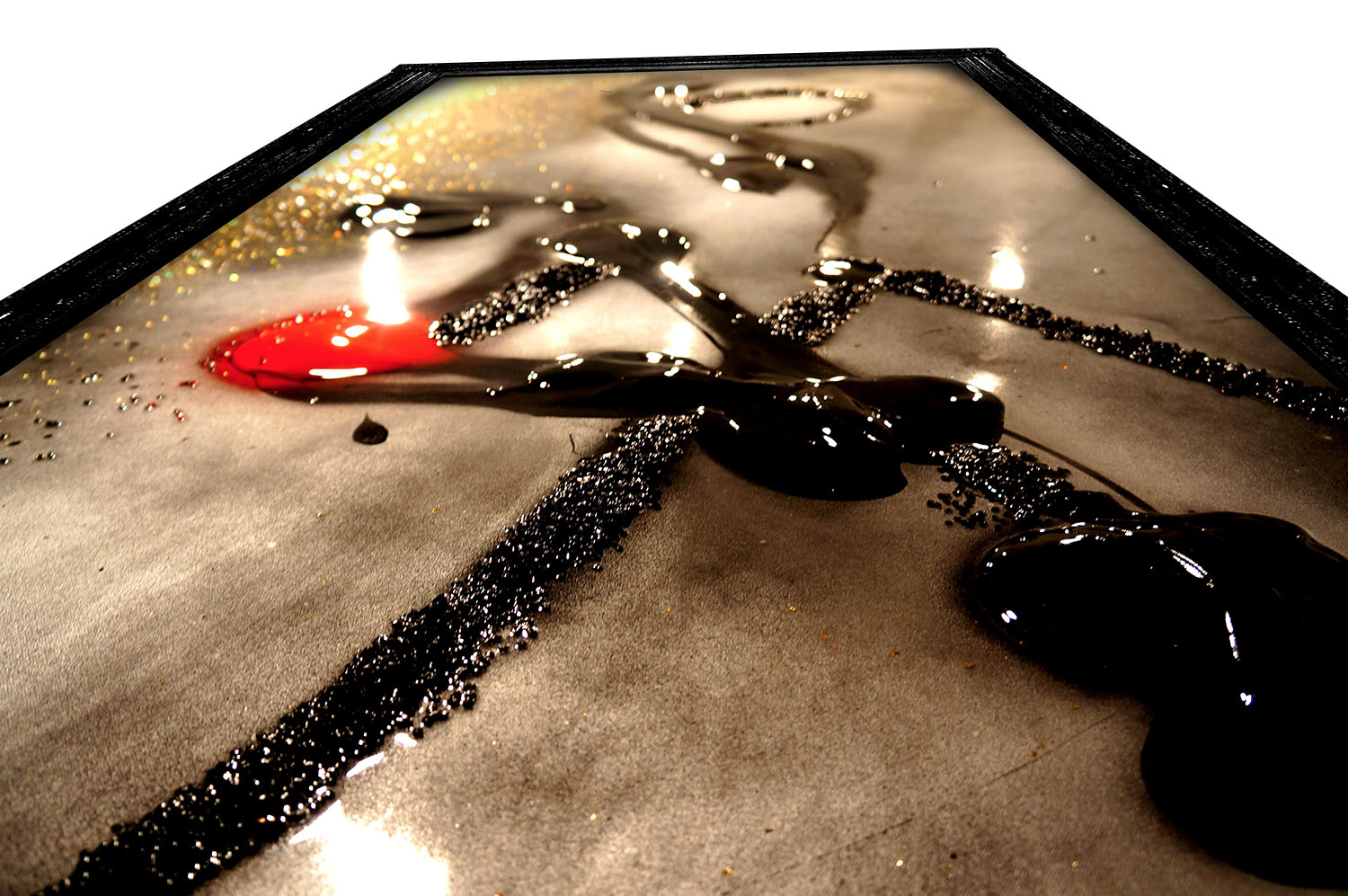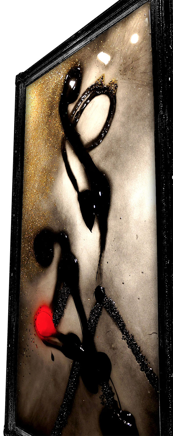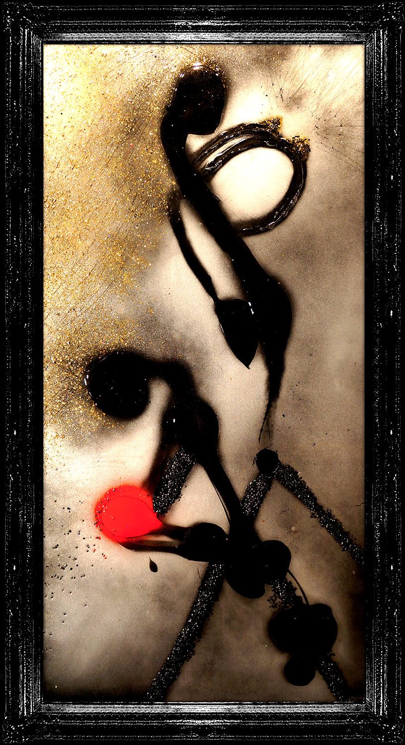 - Mixed media on canvas: acrylic, spray paint, studs, pearls, sparkles, epoxy, celestite crystal