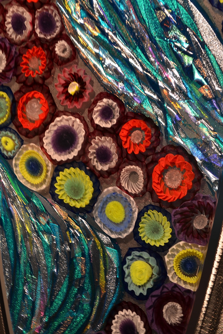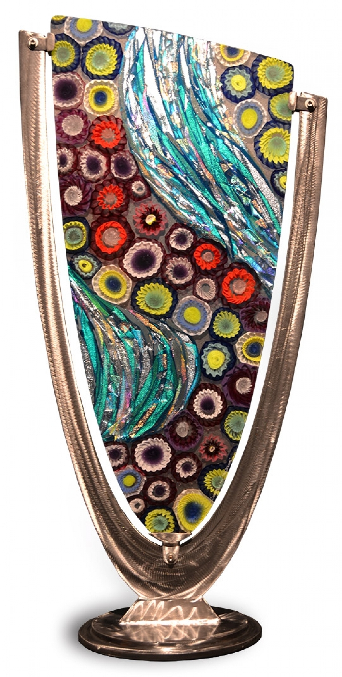 - Hand-blown hot glass fused with brilliant dichroic glass