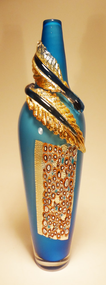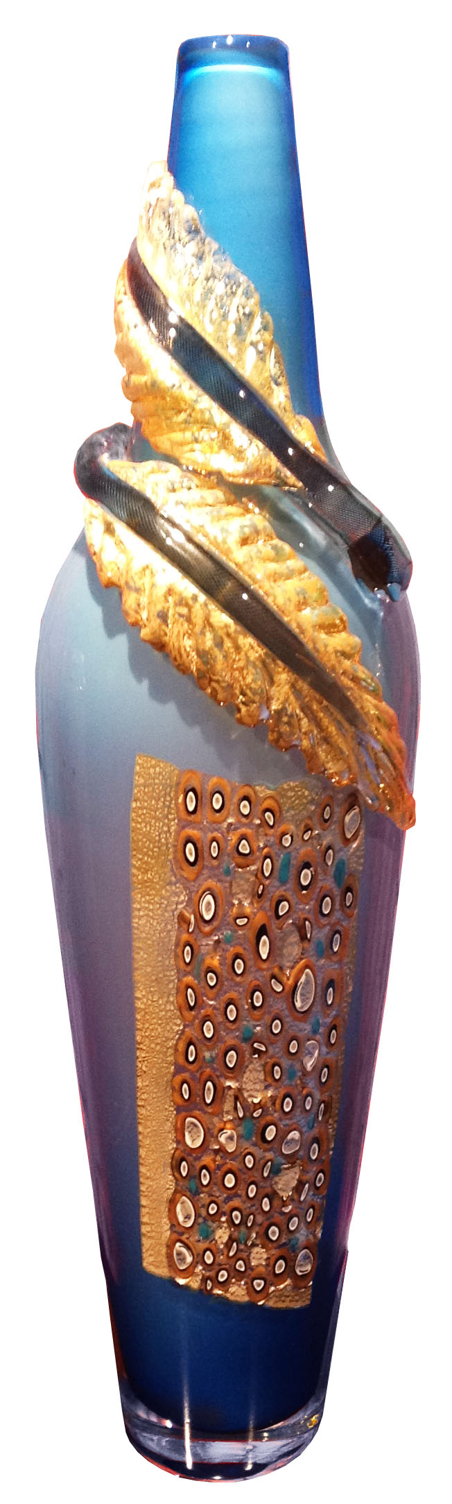 Elegant in form and color, this one of a kind vessel has feathers overlapping each other to bring movement from top to bottom.