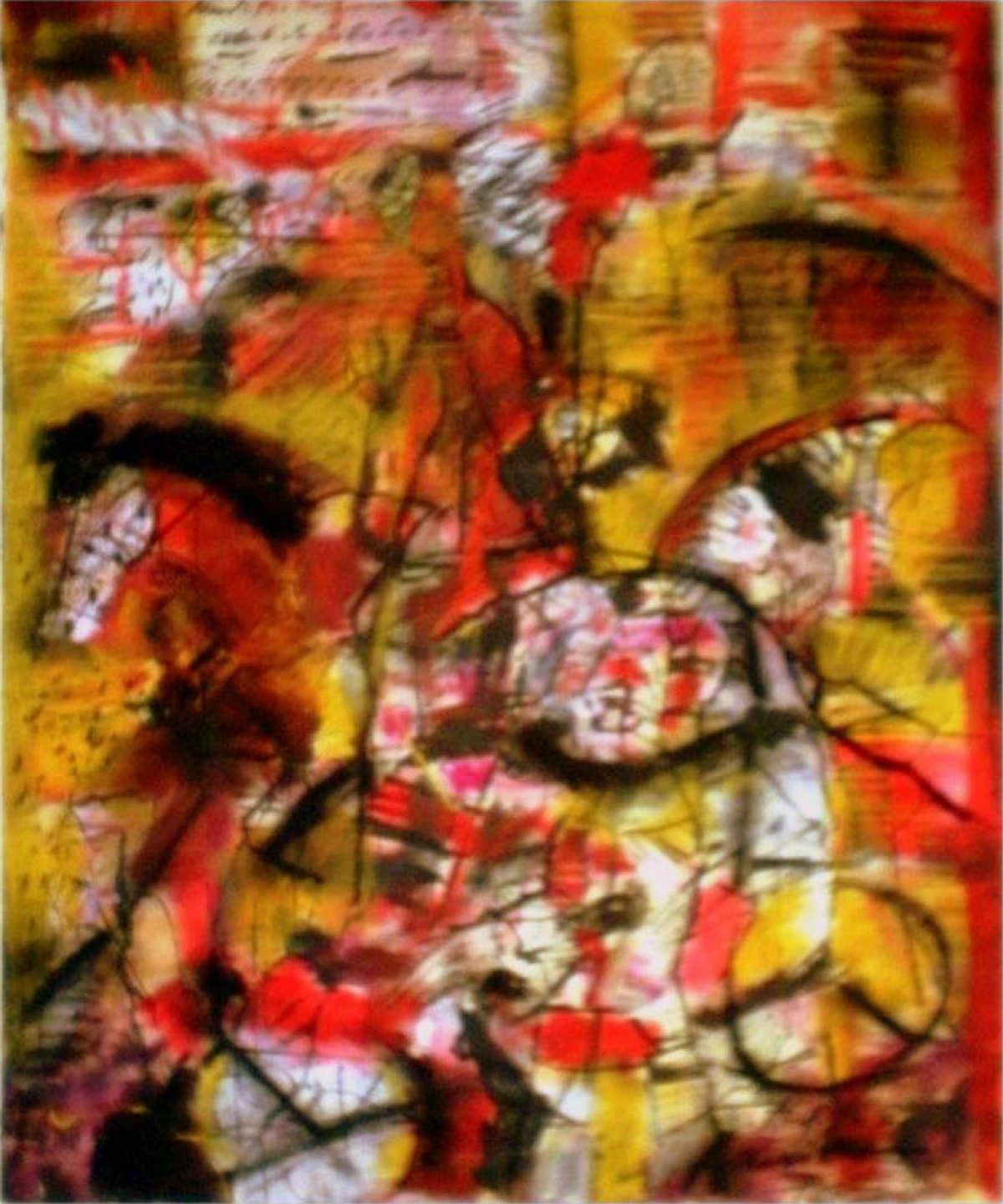 Aculina’s Areion is conversant with the major movements in abstraction while remaining distinctly rooted in her own Greek cultural background. Wassily Kandinsky founded the group the Blue Rider. His circle of painters believed that color had higher meaning. For them, blue was the color of spiritual enlightenment. Aculina’s rider delivers the same message of spiritual enlightenment, but instead of Kandinsky’s placid blue, her rider is enveloped in a firestorm of red and yellow. We see broken wheels beneath the hooves of the horse. Areion tells us that change will come but it won’t be easy. Spiritual enlightenment is possible but only if we fight to transform society for everyone. Areion was the name of a powerful horse in Greek mythology. Areion was ridden by Hercules on his adventures. Where Kandinsky felt enlightenment could be achieved by focussing only on the transformation of the self, Aculina calls for a warrior to transform society for the betterment of everyone.