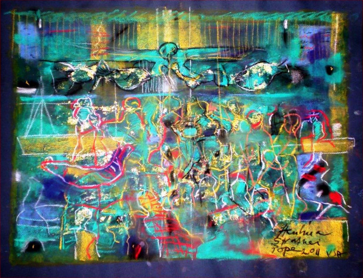 In the messenger we experience the fulfillment of the Dove’s promise. We see the dove in flight, free from her confines, gliding low over the horizon, sweeping her wings over the people. The field is alive with energetic color, the people seem to dance in celebration. The throng stands on the shore of a lake, and fish leap from the water to join them. Magical transformations take place, a boatman’s skiff becomes a fish, a giant bird frolics among them. The message of peace brings radical changes, things never before thought possible; a new interchange of ideas. The world is suddenly overflowing with new possibilities.